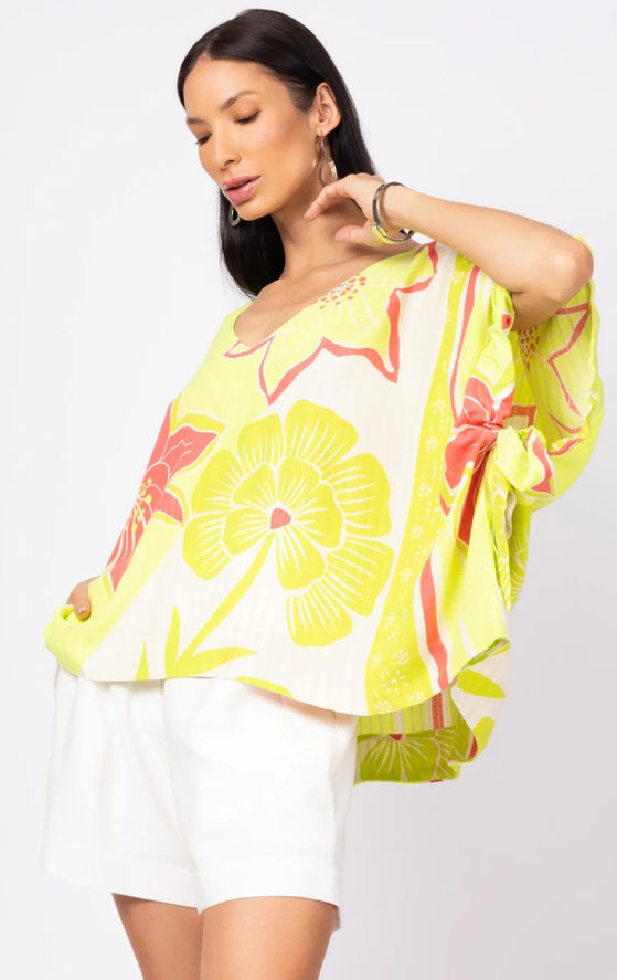 Esta bata é uma peça ampla e confortável, com mangas curtas e largas, ideal para um visual casual e fresco. O decote em "V" adiciona um toque de elegância, enquanto a estampa tropical vibrante com flores grandes, traz um ar alegre e descontraído.